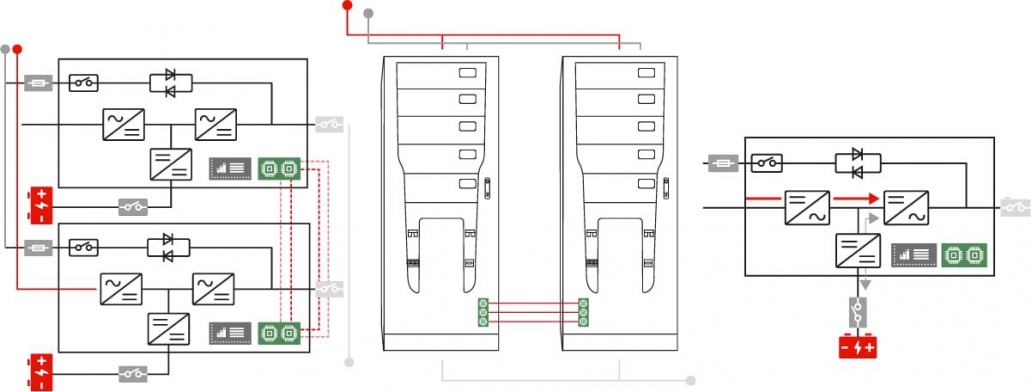 Einige USV-Architekturen verwenden immer noch zentralisierte kritische Komponenten wie eine Single Bypass Architecture (SBA). Zentralisierte Komponenten in einem parallelen System repräsentieren einzelne Fehlerpunkte. Im Gegensatz zu den zentralen Architekturen ist die modulare USV von Cumulus, CumulusPower™, mit einer Distributed Bypass Architecture (DBA) ausgestattet, die selbst in der Bypass-Leitung die volle Redundanz bietet und so jede einzelne Fehlerstelle des Systems vermeidet.