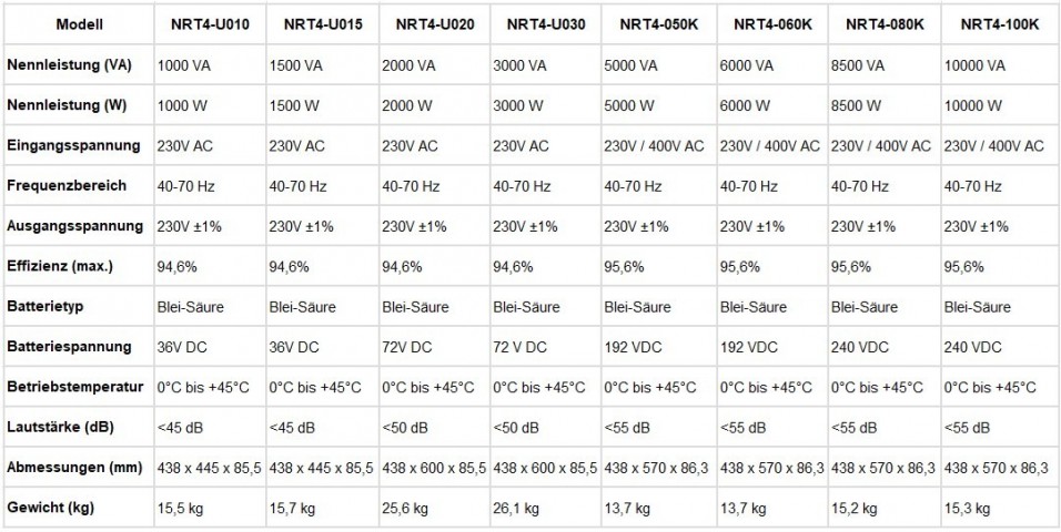 Online-Doppelumwandlung mit sinusförmiger Wellenform zum Herausfiltern aller Störungen aus bzw. zum Netz sowie Gewährleistung des maximalen Schutzes der Anlage.Die breite Toleranz hinsichtlich der Eingangsspannung reduziert die Umschaltvorgänge in den Batteriemodus und verlängert dadurch die Lebensdauer der Batterie. 1+1 Parallelkonfiguration und redundante Konfiguration möglich, um die Verfügbarkeit kritischer Verbraucher zu maximieren (bis zu 22 kVA). Einsteckbarer manueller Bypass mit Hot- Swap-Funktion.